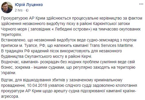 "Установлено, что добычу ведет судно-земснаряд с портом приписки г.Туапсе, РФ, которое принадлежит кампании Trans Services Maritime… В то же время, кампания-расхититель без проблем с совестью ведет свой бизнес, в частности - другими судами, которые регулярно заходят на территорию Украины. Следовательно, для возмещения убытков в указанном уголовном производстве, 10.04.2018 постановлением следственного судьи удовлетворено ходатайство прокуратуры АР Крым об аресте судна подозреваемой кампании страны-агрессора", - написал Луценко.