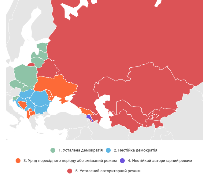 Что касается Украины, авторы доклада отмечают, что впервые с 2014 года, зарегистрирован спад показателей демократических процессов. Нынешняя демократическая оценка Украины составляет 4,64 балла (где 1 балл - показатель устойчивой демократии, а 6-7 - это уже устоявшийся авторитарный режим).