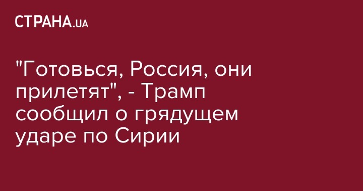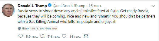 "Готовься, Россия, они прилетят. Они будут хорошие, новые и "умные"! Не надо поддерживать животное, которое убивает газом своих граждан и получает удовольствие!", - написал Трамп.