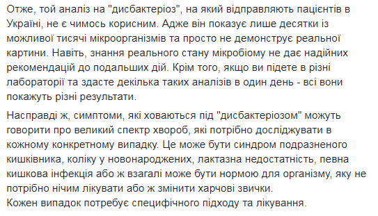 Итак, анализ на "дисбактериоз", на который отправляют пациентов в Украине, не является чем-то полезным. Ведь он показывает только десятки с, возможно, тысячи микроорганизмов (из микрофлоры человека - Прим.Ред.) и просто не демонстрирует реальную картину. Даже знание реального состояния микробов не дает надежных рекомендаций к дальнейшим действиям. Кроме того, если вы пойдете в разные лаборатории и сдадите несколько таких анализов в один день - все они покажут разные результаты.