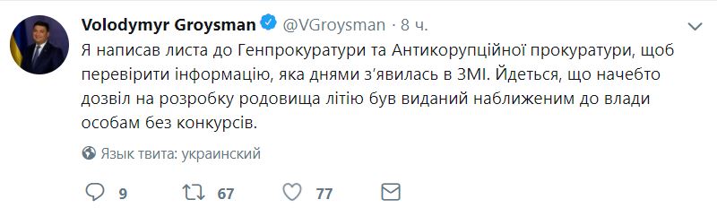 "Я написал письмо в Генпрокуратуру и Антикоррупционной прокуратуры, чтобы проверить информацию, которая на днях появилась в СМИ. Речь идет, как будто разрешение на разработку месторождения лития был издан приближенным к власти лицам без конкурсов", - написал Гройсман.