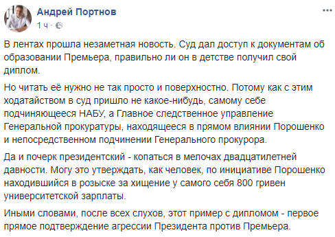 Иными словами, после всех слухов, этот пример с дипломом - первое прямое подтверждение агрессии Президента против Премьера", - написал Андрей Портнов.