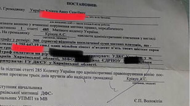 Девушку обвиняют в уклонении от уплаты таможенного налога. Документ с соответствующим постановлением опубликовала на своей странице в сети бывшая сотрудница патрульной полиции Ляна Теремкова.