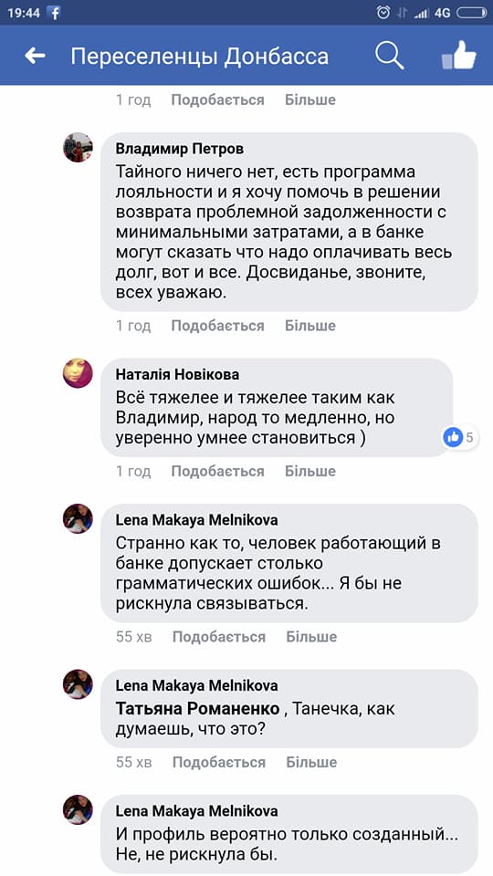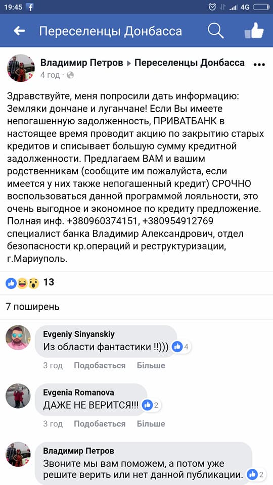 "Обнаружен сейчас аттракцион невиданной щедрости от якобы "сотрудника банка", который всем с оккупированных территорий помогает кредиты "списывать". По акции. По возможности, предупредите родных и знакомых, ну и сами никогда таком не верьте и не оставляйте подобным проходимцам никакой информации. Но его наглость в комментариях впечатляет, конечно", - написала Музычук и привела скрины объявлений одного из таких мошенников.