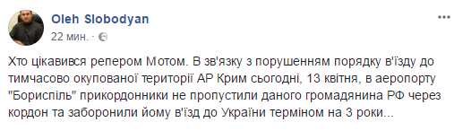 "Кто интересовался репером Мотом. В связи с нарушением порядка въезда на временно оккупированную территорию АР Крым сегодня, 13 апреля, в аэропорту "Борисполь" пограничники не пропустили данного гражданина РФ через границу и запретили ему въезд в Украину сроком на 3 года", - написал Слободян на своей странице в соцсети Facebook в пятницу.