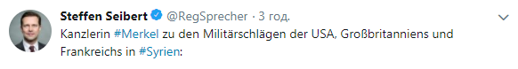 Германия поддержала совместный авиадуар США, Великобритании и Франции в Сирии. Об этом в Twitter сообщил представитель правительства Штеффен Зайберт, опубликовав заявление канцлера Ангелы Меркель.