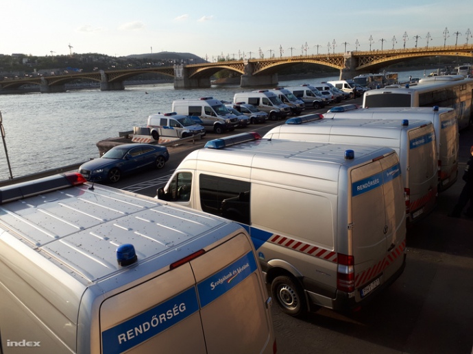 Протестующие против Орбана движутся к зданию парламента. На акции присутствуют участники, которые демонстрируют свою приверженность "левым" или либеральным партиям, однако есть и "правые". На набережной скопилось много полицейских машин.