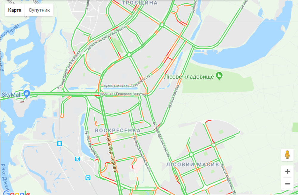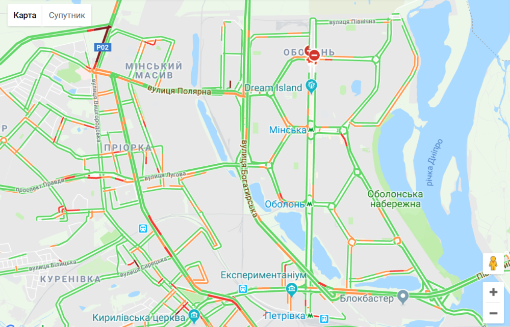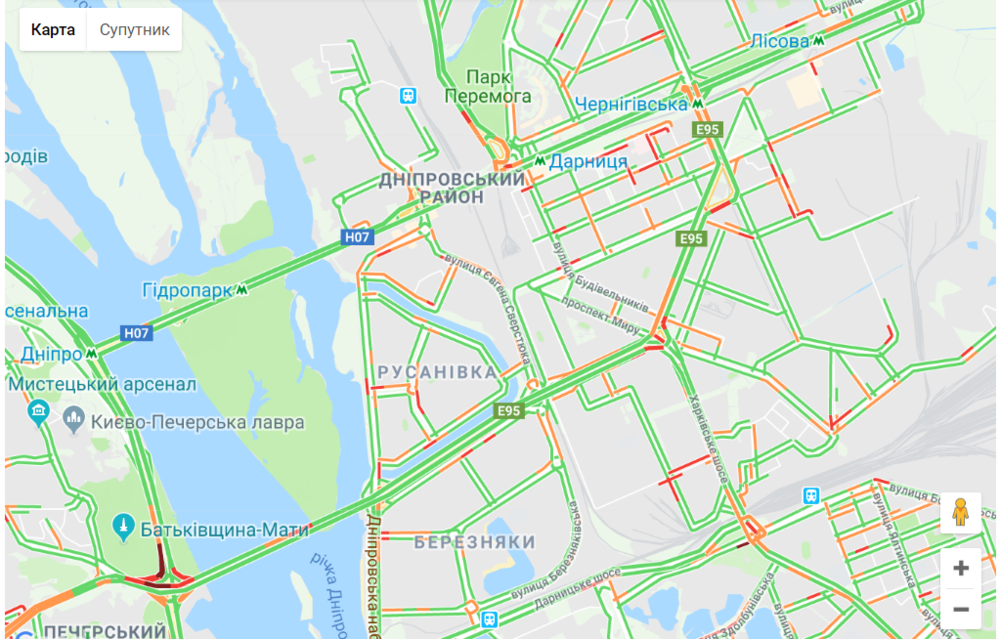 Автомобили медленно движутся на улице Телиги, Набережном шоссе, автомобильной развязке на станции метро "Выдубичи" и проспекте Победы.