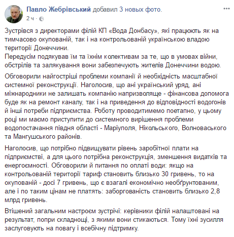 Глава Донецкой областной военно-гражданской администрации Павел Жебривский заявляет, что долг за поставки воды в отдельные районы Донецкой области, неподконтрольные Украине, составляет 2,8 млрд грн, хотя расчеты производятся по меньшему тарифу.