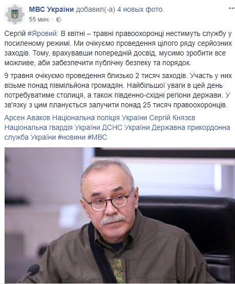 "9 мая ожидаем проведение около 2 тысяч мероприятий. Участие в них примет более полумиллиона граждан. Наибольшего внимания в это день потребует столица, а также юго-восточные регионы страны. В связи с этим планируется привлечь более 25 тысяч правоохранителей", - говорится в сообщении в соцсети.