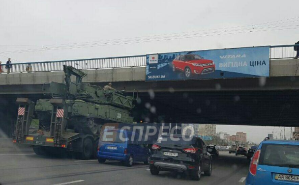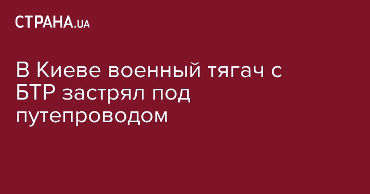 В Киеве военный тягач с БТР застрял под путепроводом