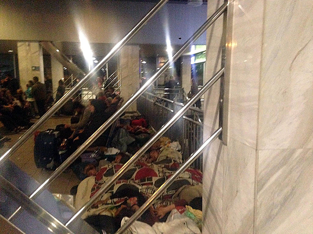 На кадрах видно, как люди спят на одеялах и сумках прямо на полу. Многие – матери с детьми. Среди многочисленной семьи ромов есть разновозрастные люди и инвалиды.