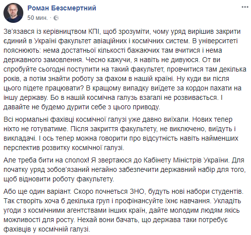 "Связался с руководством КПИ, чтобы понять, почему правительство решило закрыть единственный в Украине факультет авиационных и космических систем. В университете объясняют: нет достаточного количества желающих там учиться, и нет государственного заказа. Честно говоря, я даже не удивляюсь. Вот вы попробуйте сегодня поступить на такой факультет, проучиться там несколько лет, а потом найти работу по специальности в нашей стране. Ну куда вы после этого пойдете работать? В лучшем случае уедете за границу пахать на другое государство. Потому что в нашей космическая отрасль вообще не развивается. И давайте не будем обманывать себя по этому поводу", - пишет Роман Бессмертный.