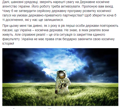 Или еще один вариант. Скоро начнется ВНО, будут новые наборы студентов. Так создайте хотя бы несколько групп и профинансируйте их обучение. Уложите соглашения с космическими агентствами других стран, дайте молодым людям какие-то возможности для роста. Пусть они видят, что государство таки нуждается в специалистах в космической отрасли", - пишет политик, который предлагает чиновникам также обратить внимание на Государственное космическое агентство Украине.