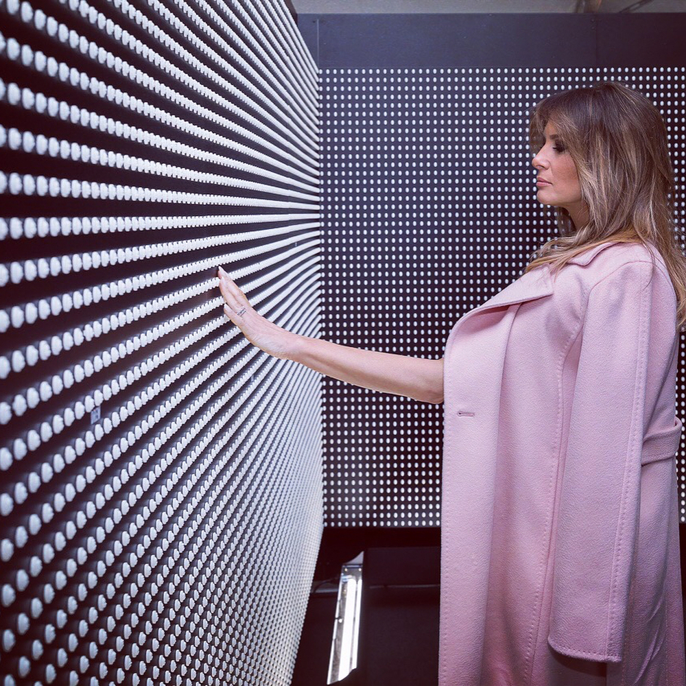 Стена мемориала состоит из 22 тысяч таблеток, на каждой из которых высечен портрет. В Вашингтоне он расположен в Эллипсисе в южной части Президентского парка, куда приехала первая леди страны — в бархатных лодочках канареечного цвета Christian Louboutin и нежном пудровом пальто Max Mara.