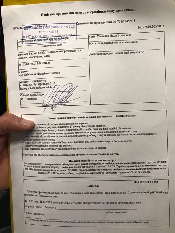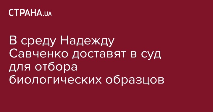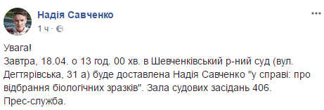 "Завтра, 18.04, в 13:00 в Шевченковский р-ный суд будет доставлена Надежда Савченко "по делу: об отборе биологических образцов". Зал судебных заседаний 406", - сообщается на странице депутата в соцсети Facebook.