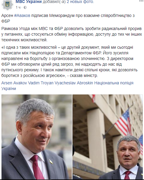 Министр внутренних дел Украины Арсен Аваков в рамках рабочего визита в США провел встречу с директором Федерального бюро расследований (ФБР) Кристофером Реем по итогам которой стороны подписали Меморандум о взаимном сотрудничестве.