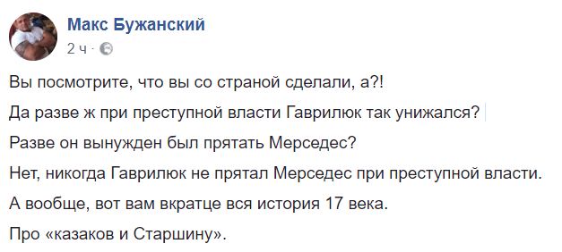 "Вы посмотрите, что вы со страной сделали, а?! Да разве ж при преступной власти Гаврилюк так унижался? Разве он вынужден был прятать Мерседес?
