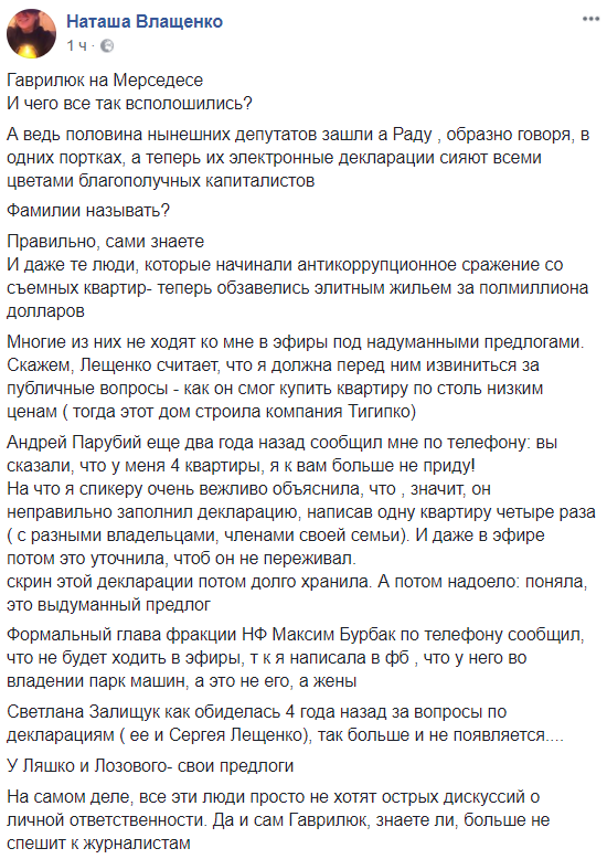 "Прочитала о господине Гаврилюке и мерседесе. И вопрос вовсе не к нему и не к ним. Расскажу коротко по собственному опыту историю: в предвыборный период в парламент 2014 года, пришла мода ходить в военной форме кандидатам в депутаты. Доходило до абсурда: некоторые из них приходили на ТВ форме в кулечках, переодевались в гримерных, цепляли медальки, погоны, эполеты, кто что мог, или ему посоветовал политтехнолог - и шли в эфир рассказывать о своих подвигах.