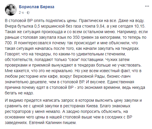 "Вчера бутылка 0,5 моршинской без газа стоила 9,84, а уже сегодея 10,15. Такая же ситуация произошда и со всем остальном меню. Например, если раньше столовая закупала язык по 350 гривен за килограмм, то теперь по 700", - пишет нардеп.