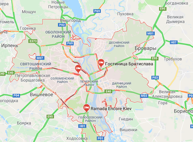 Пробки есть на проспектах Победы (от центра и в цирк в обе стороны, от метро "Шулявская" в сторону Святошинского района), Голосеевском, улицах Большая Житомирская, Вячеслава Чорновила, Богдана Хмельницкого, Владимирской, бульварах Леси Украинки и Дружбы Народов (в сторону Печерского моста), на Подоле (почти все улицы пересекающих Нижний Вал и Верхний Вал), Большая Васильковская и всех прилегающих к ним улицах. Пробка образовалась на Набережном шоссе в от моста Метро и до Почтовой площади (в обе стороны - ремонтные работы и ДТП).