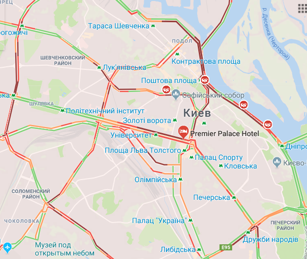 Движение автотранспорта затруднено в центральной части Киева, особенно в районе станций метро "Дружбы народов", "Лыбидская", "Дворец Украина", "Олимпийская", "Университет", "Театральная", "Золотые ворота", "Кловская", "Майдан Незалежности", "Крещатик", "Контрактовая площадь", "Почтовая площадь" и другие.