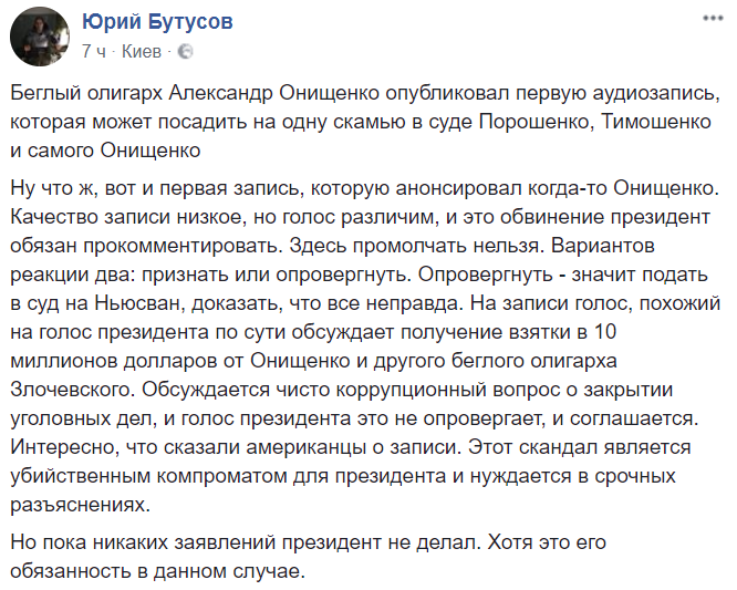 "В любой цивилизованной стране был бы импичмент и реальный тюремный срок. Аудиозапись не оставляет сомнений и вариантов для манипуляций, Порошенко – коррупционер, как и его ближайшее окружение. Это очередное доказательство того, что президент использует свою власть для личного обогащения, и наконец-то мы получили прямые тому конкретные доказательства.