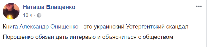 "Книга Александр Онищенко – это украинский Уотергейтский скандал. Порошенко обязан дать интервью и объясниться с обществом", – считает телеведущая Наталья Влащенко.