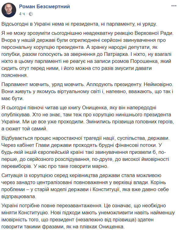 "Я не могу понять сегодняшнюю неадекватную реакцию Верховной Рады. Вчера в нашем государстве были обнародованы серьезные обвинения о персональной коррупции президента. А утром народные депутаты, как голубки, вместе голосуют за обращение к Патриарху. И никто, ну вообще никто в этом парламенте не реагирует на записи разговоров Порошенко, который сидит тут перед ними, и его можно сто раз заставить дать объяснения.