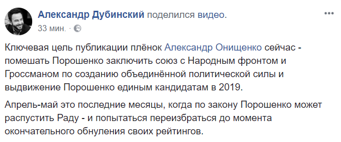 "Ключевая цель публикации пленок Александра Онищенко сейчас – помешать Порошенко заключить союз с «Народным фронтом» и Гройсманом по созданию объединенной политической силы и выдвижение Порошенко единым кандидатам в 2019-м.