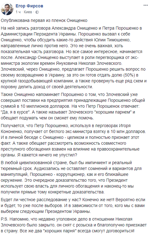 На записи голос, похожий на голос президента, по сути, обсуждает получение взятки в 10 миллионов долларов от Онищенко и другого беглого олигарха Злочевского. Обсуждается чисто коррупционный вопрос о закрытии уголовных дел, и голос президента это не опровергает и соглашается.