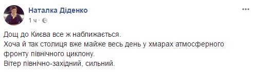 "Дождь к Киеву все же приближается. Хотя и так столица уже почти весь день в облаках атмосферного фронта северного циклона. Ветер северо-западный, сильный", - написала она.