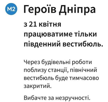 С 21 апреля будет закрыт северный вестибюль станции "Героев Днепра" в связи с проведением ремонта.