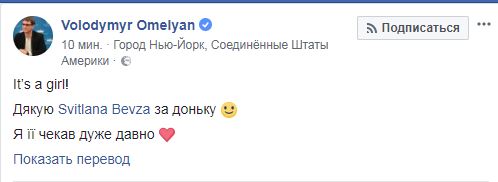 "Девочка! Спасибо Светлане Бевзе за дочку. Я ее ждал очень давно!", - написал Омелян.