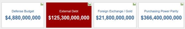 Еще одно больное место каждой Украины - это размер внешнего государственного долга, который по данным Global Firepower, составил 125,3 миллиарда долларов, что на 2,4 миллиарда меньше, чем в прошлогоднем рейтинге.