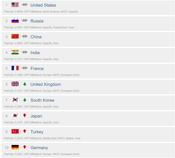 По мнению составителей рейтинга, совокупная военная мощь Украины стоит между Грецией и Чехией. Пятерку сильнейших государств мира возглавили США. За ними следуют вооруженные силы России, Китая, Индии и Франции.