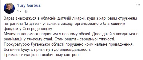 "Медицинская помощь предоставляется в полном объеме. Двое детей находятся в реанимации в тяжелом состоянии. Состояние остальных - средней тяжести", - написал Гарбуз.