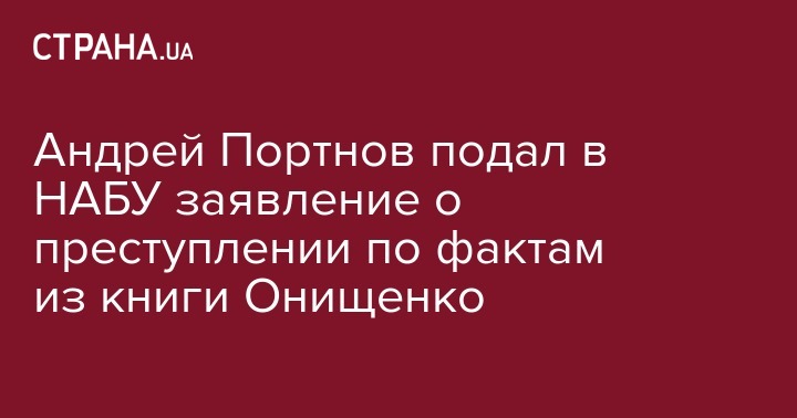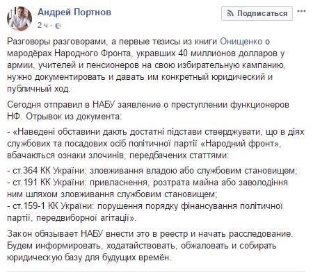 Известный юрист Андрей Портнов заявил, что фактам коррупционных схем, изложенных в книге Онищенко он направил в НАБУ заявление о преступлении, совершенно руководителями партии "Народный фронт".