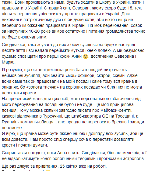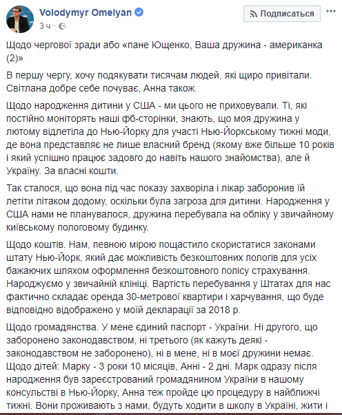 Правда, Омелян пишет, что у его родившихся в США детей на данный момент гражданство украинское.