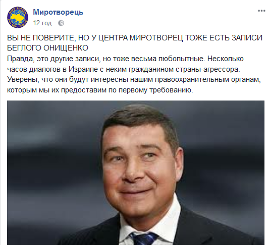 "Вы не поверите, но у центра Миротворец тоже есть записи беглого Онищенко. Правда, это другие записи, но тоже весьма любопытные. Несколько часов диалогов в Израиле с неким гражданином страны-агрессора. Уверены, что они будут интересны нашим правоохранительным органам, которым мы их предоставим по первому требованию", - говорится в сообщении.