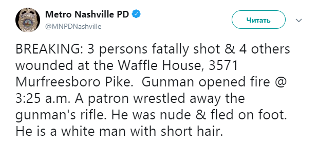 "Три человека убиты, еще четверо пострадали в результате стрельбы около Waffle House. Вооруженный человек открыл стрельбу в 3:25 по местному времени (11:25 по Киеве). Посетитель выбил у него оружие", - сказано в сообщении полиции.
