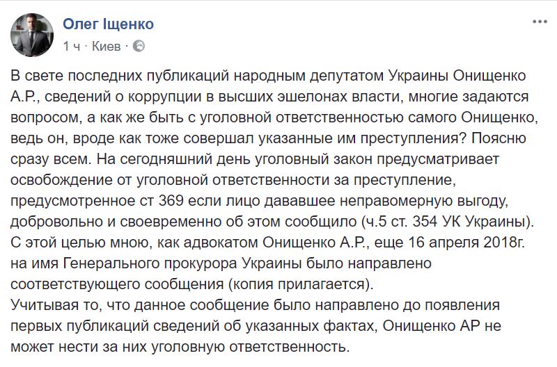 Адвокат Ищенко пишет, что "в свете последних публикаций народным депутатом Украины Онищенко А.Р., сведений о коррупции в высших эшелонах власти, многие задаются вопросом, а как же быть с уголовной ответственностью самого Онищенко, ведь он, вроде как тоже совершал указанные им преступления?"