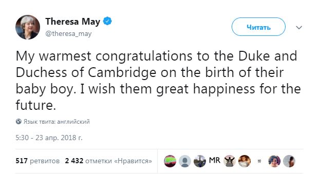 "Мои самые лучшие пожелания герцогу и герцогине Кембриджским с связи с рождением мальчика. Я желаю им огромного счастья в будущем", — заявила Мэй.