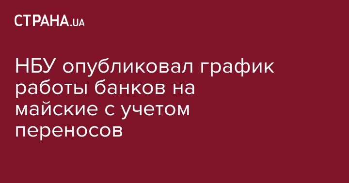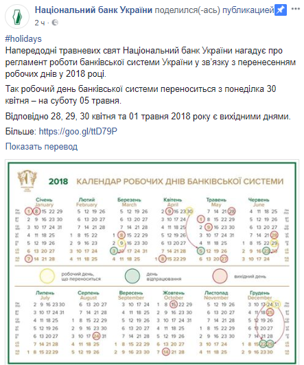 Нацбанк Украины напомнил о регламенте работы системы электронных платежей и банковской системы Украины в период майских праздников. График опубликован на странице ведомства в Facebook.