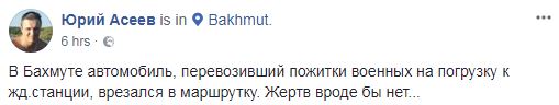 "В Бахмуте автомобиль, перевозивший пожитки военных на загрузку к железнодорожной станции, врезался в маршрутку. Жертв вроде бы нет...", - написал он.
