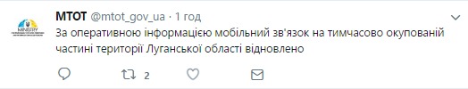 Министерство по вопросам временно оккупированных территорий и внутренне перемещенных лиц Украины сообщило о возвращении связи в так называемой "ЛНР" в Тwitter.