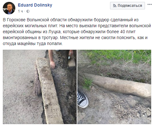 В Волынской области в городе Горохове обнаружили бордюр, который сделан из могильных плит еврейских захоронений. Об этом на своей странице в Facebook написал директор Украинского еврейского комитета Эдуард Долинский.