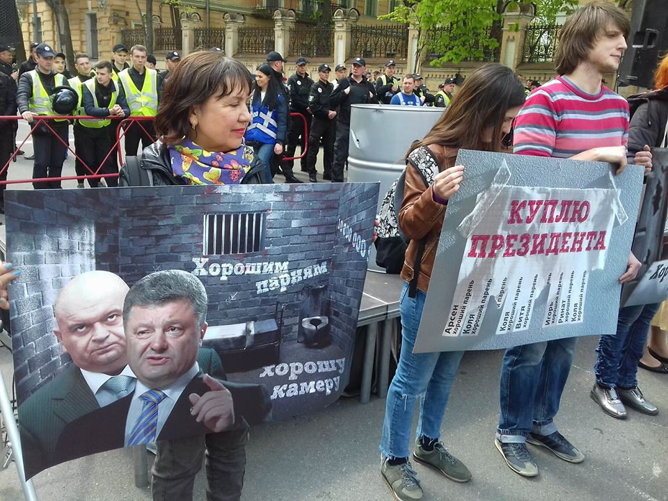 Мероприятие состоялось на улицах Институтской и Банковой, собралось порядка 150 человек. По данным корреспондента "Страны", часть людей пришли с плакатами, например, в виде объявления с надписями "Куплю президента" или "Хорошим парням хорошую камеру" с изображением президента Петра Порошенко и его соратника Игоря Кононенко.