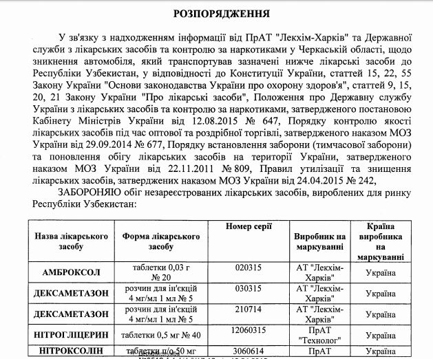 В документе говорится, что в стране запретили оборот незарегистрированных препаратов, которые изготовили на украинском фармацевтическом предприятии "Лекхим-Харьков" для рынка Узбекистана. Вместе с "Амброксолом" в черный список попали и другие лекарства, среди которых "Дексаметазон", "Нитроглицерин", "Супрастилин", "Трисептол" и "Цефтриаксон".