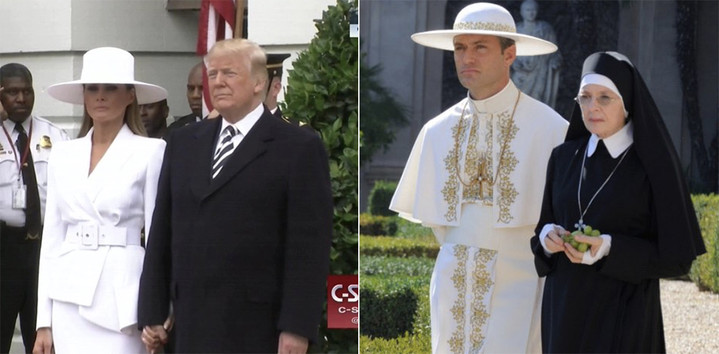 Также пользователи обсудили широкополую шляпу Мелании Трамп. Некоторые предположили, что она надела такую шляпу специально, чтобы муж не мог ее поцеловать. Также ее внешний вид сравнили с видом главного героя сериала "Молодой Папа".
